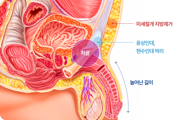 음경 기저부를 지지하는 윤상인대를 일부 조정하여 묻혀 있는 길이를 외부로 유도하는 수술입니다. 과도한 절제가 아닌 해부학적 범위 내에서 진행하며, 외부 노출을 유지할 수 있도록 고정이 중요합니다. 지지 구조의 안정성이 수술 결과에 큰 영향을 줍니다.