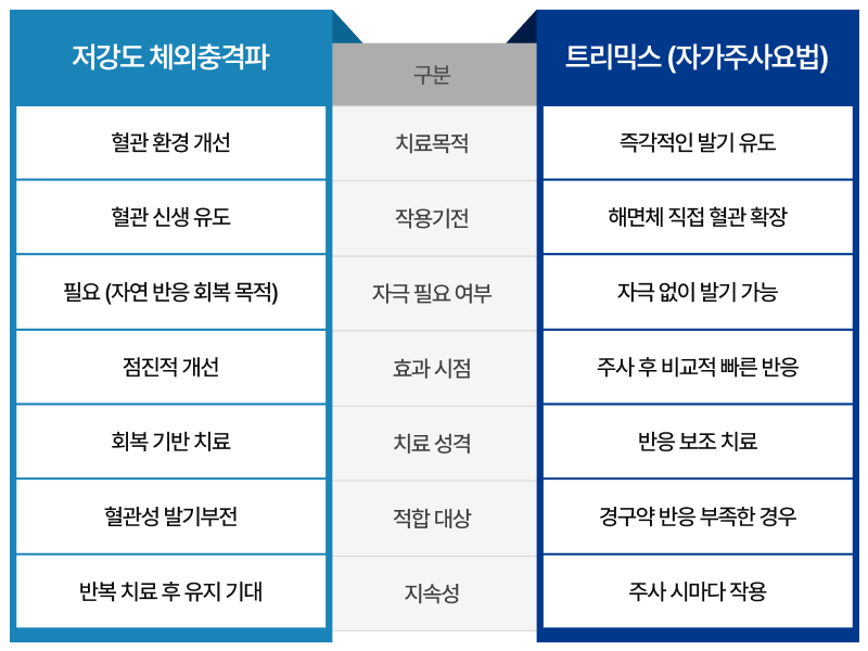 저강도 체외충격파는 조직에 미세한 기계적 자극을 주어 혈관 신생(angiogenesis)을 유도하는 방식입니다. 특히 혈관성 발기부전에서 보조 치료로 고려됩니다.